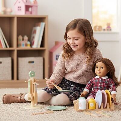 Pour enrichir les jeux autour de la dinette, vous pouvez compléter votre collection avec des accessoires thématiques. Notre maison de poupée crée un cadre idéal pour les repas imaginaires, tandis que nos poupées de chiffon feront des invités parfaits pour le restaurant de votre petit chef.
